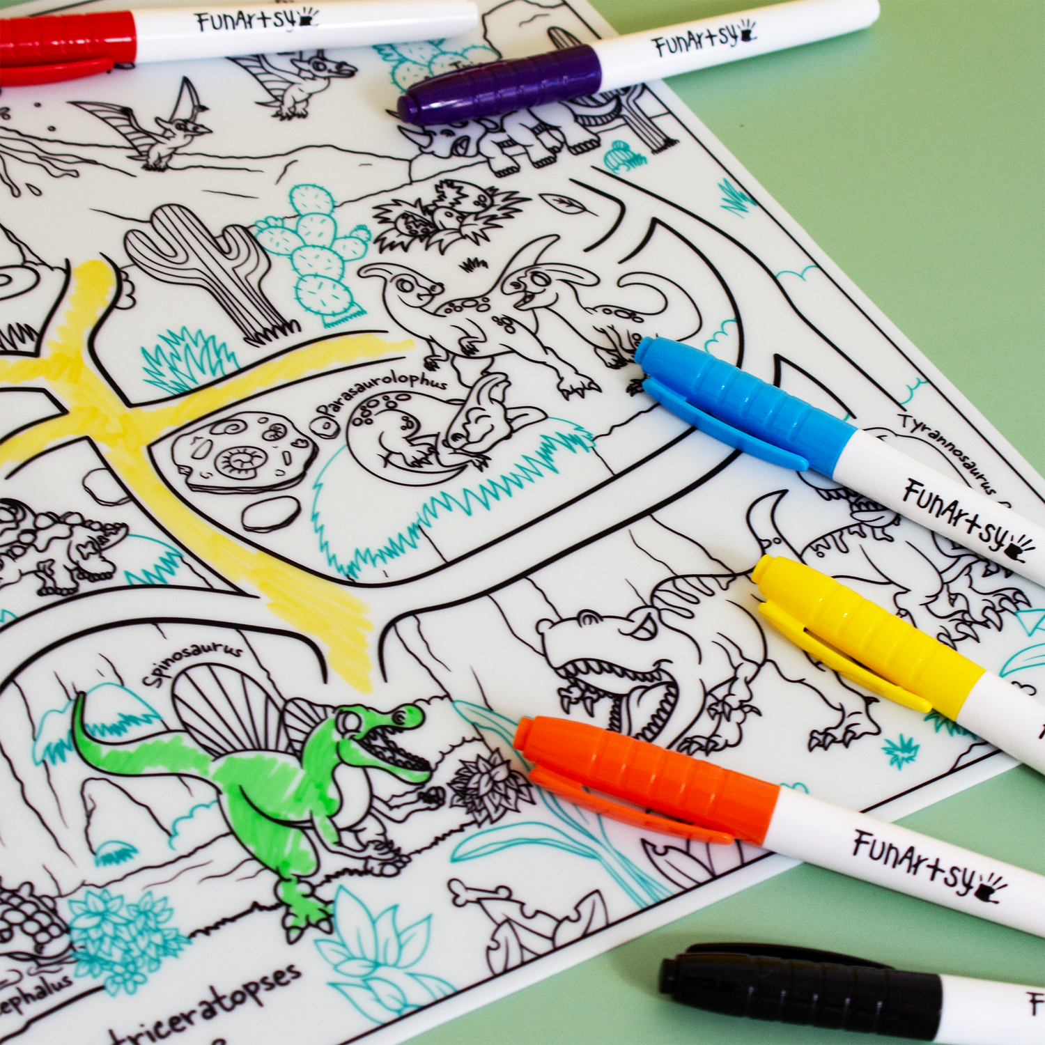 Immersive placemats to keep your little one entertained at the table longer, over and over again! Colour in the placemat then do it all again by simply washing the mat in warm water and gentle soap.